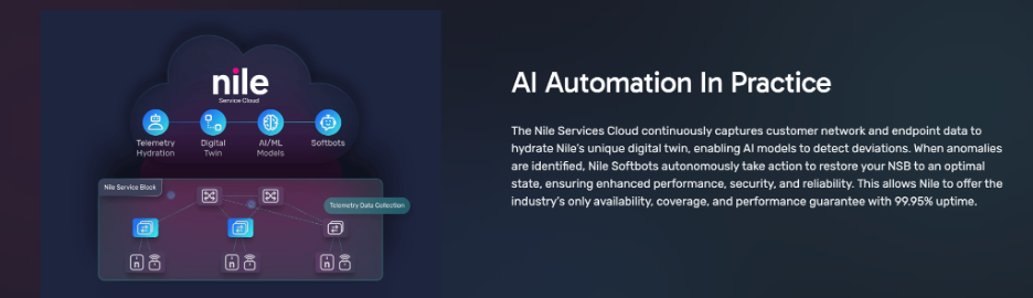 Nile’s NXI models continuously track a site’s experience, automatically root cause of the events that contributed to anomalies, and work in close conjunction with AI Automation Center’s Softbots to automatically resolve those issues. This sets Nile on a path to deliver the highest level of network autonomy in the industry.