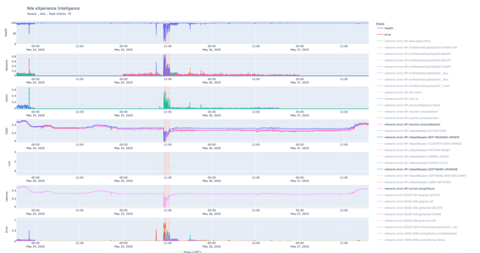Nile Services Cloud collects billions of events per day and processes 5TB+ of data generated by everything listed above. Nile Experience Intelligence (NXI) AI models are trained on this extensive time-series dataset. NXI models predict the next sequence of events based on historical events. If the next sequence of events deviates from the predicted sequence, the deviation is considered an error. The error is aggregated across all events, resulting in the aggregated site experience.
