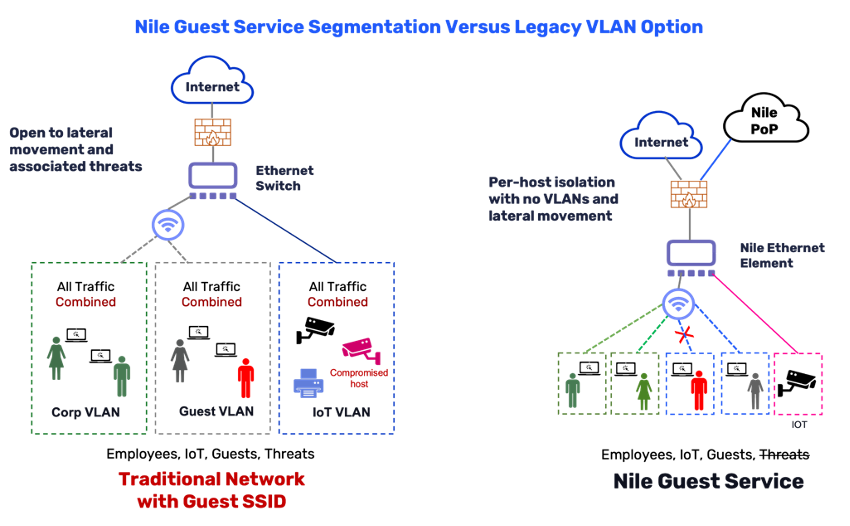 The clear advantage is a guest access network that is very secure, does not require a large amount of setup and offers cloud flexibility and management assistance. The image below shows you a high-level picture of how the Nile Guest Service stacks up architecturally versus the traditional guest service from other vendors.