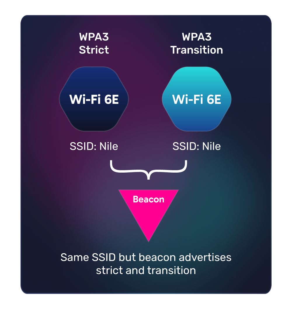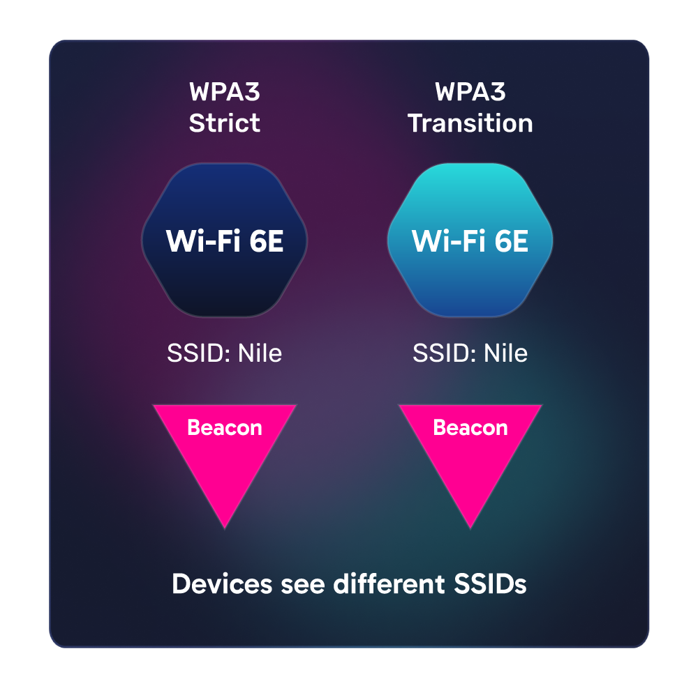 - Cons: Using a WPA3 SSID in Transition mode for the legacy bands may cause some interoperability issues when older devices try to connect. This is based on some problematic devices we’ve seen on existing Nile deployments. For e.g., where older Windows laptops with .11ac Wi-Fi could not connect to the WPA3 PSK SSID in Transition mode.
