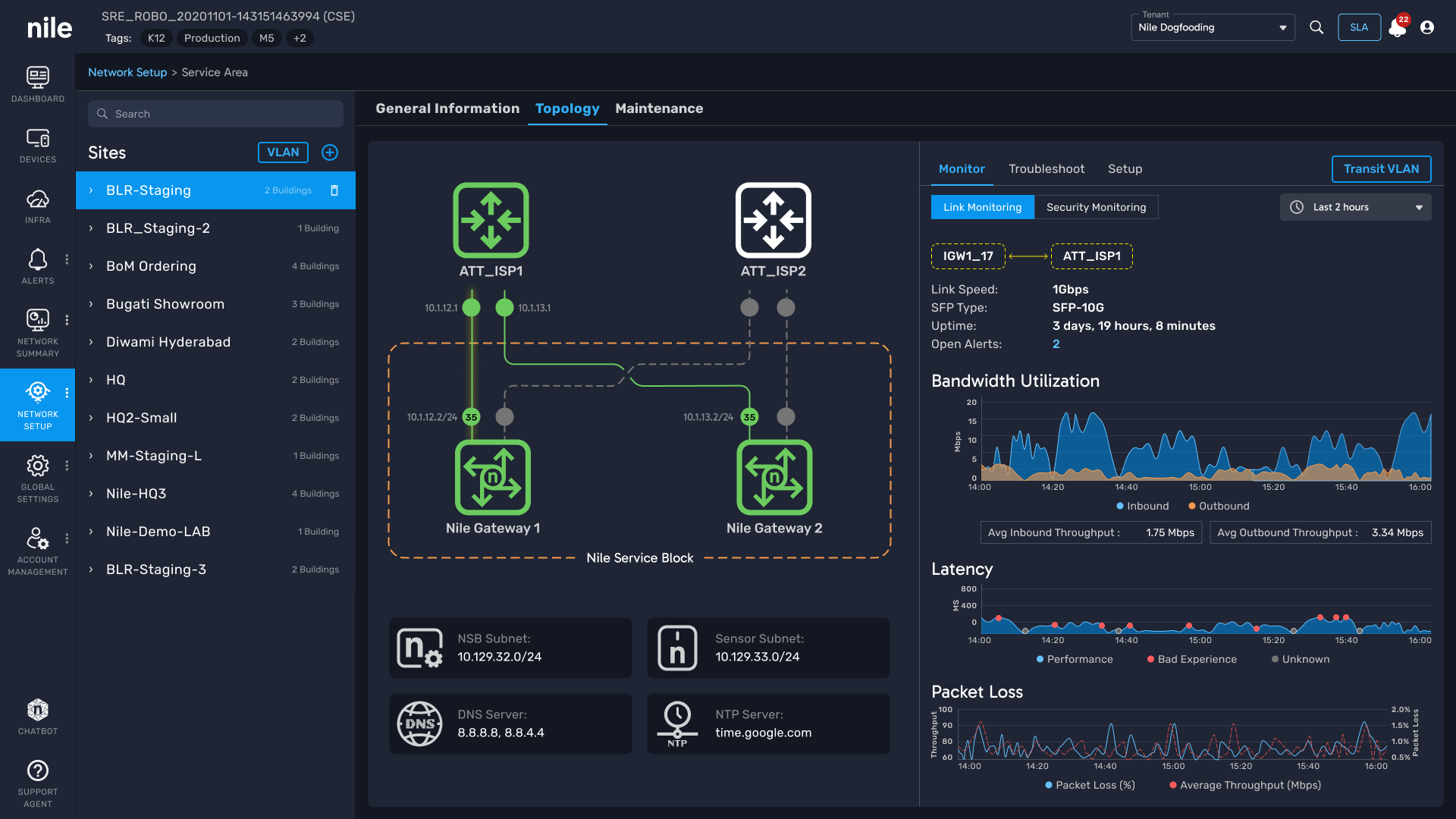 From your centralized Nile Portal, a single dashboard provides visibility into link health and performance. Built-in diagnostics enable IT teams to quickly pinpoint and resolve ISP issues without dispatching staff on-site or waiting endlessly on hold with the provider.